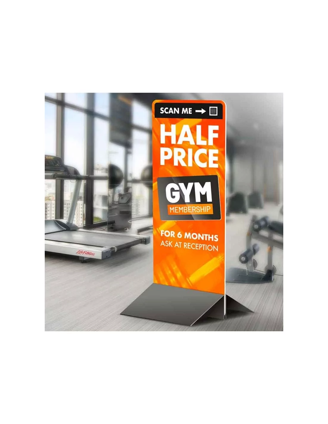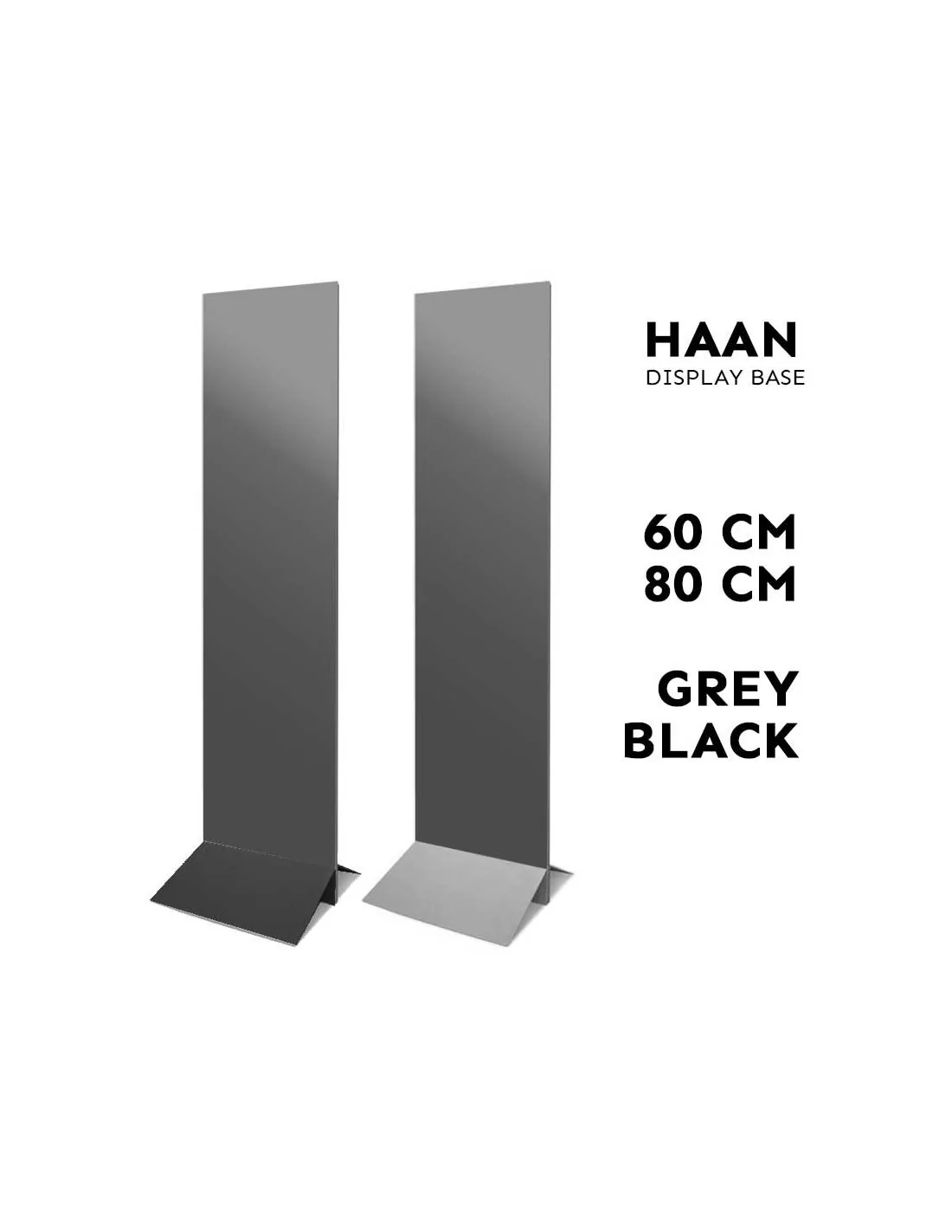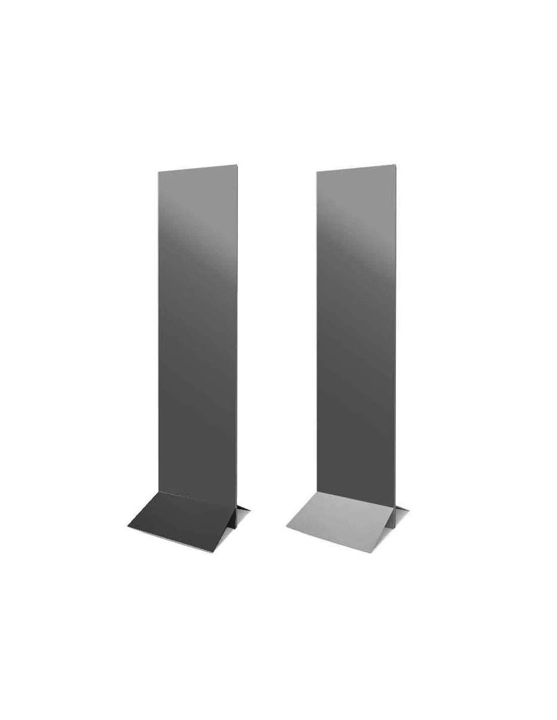 El sistema expositivo es muy sencillo, está compuesto por una estructura de acero en 2 piezas, que se unen en la parte inferior para sujetar las gráficas. Podemos suministrar la estructura de este expositor publicitario en varias dimensiones y en dos acabados: negro y gris.