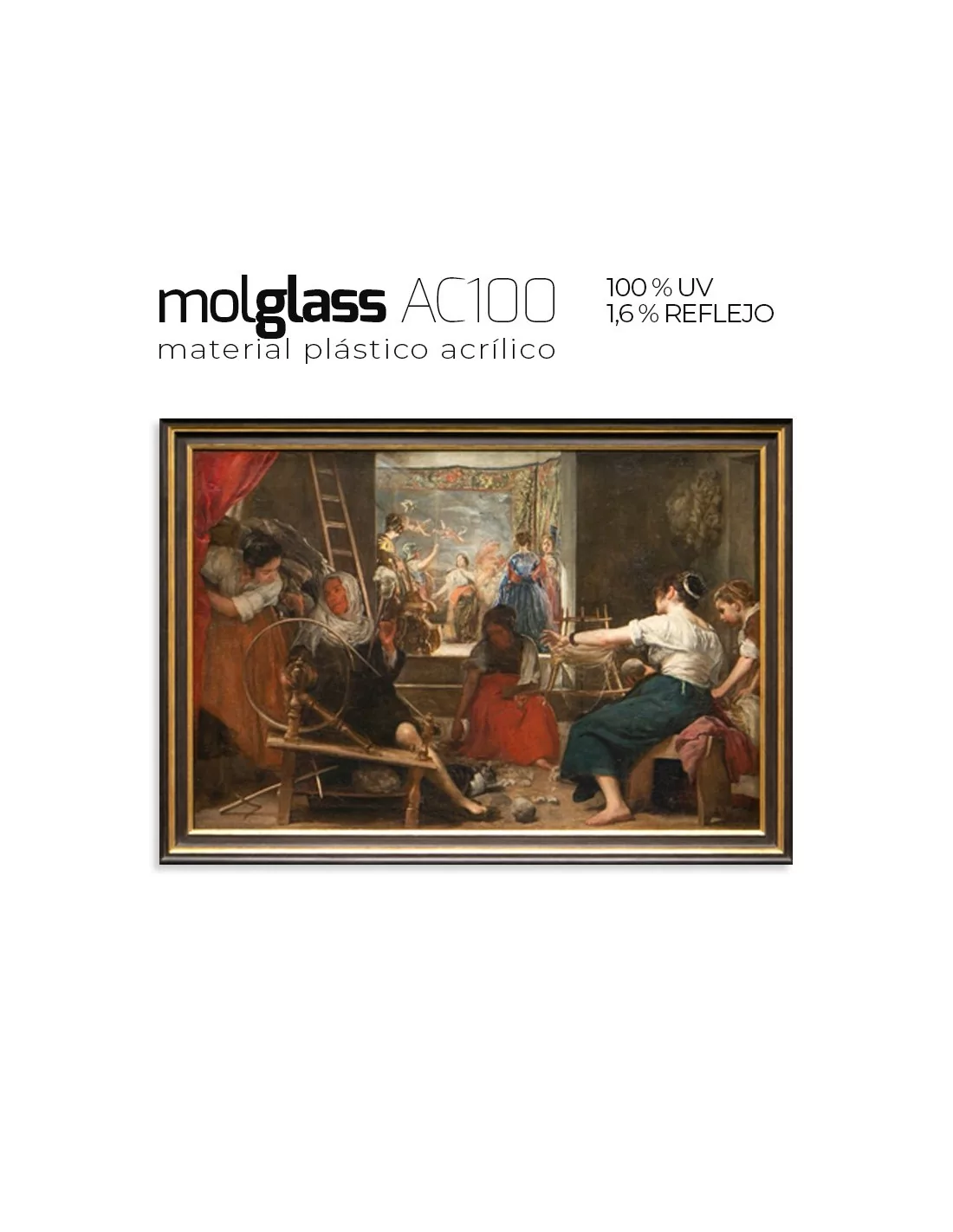Nuestro acrílico especial de máxima protección UV y transparencia total, modelo molglass-AC100 ofrece protección contra rayos UV, al bloquear el 100 % de los rayos UV dañinos, combinado con la mejor transparencia y añadiendo resistencia a la rotura. Vidrio acrílico anti-reflejo, muy difícil de rayar y antiestático, indicado en trabajos de enmarcación de grandes dimensiones para evitar los problemas de peso o rotura que podrían aparecer usando cristal. Ligero y prácticamente irrompible