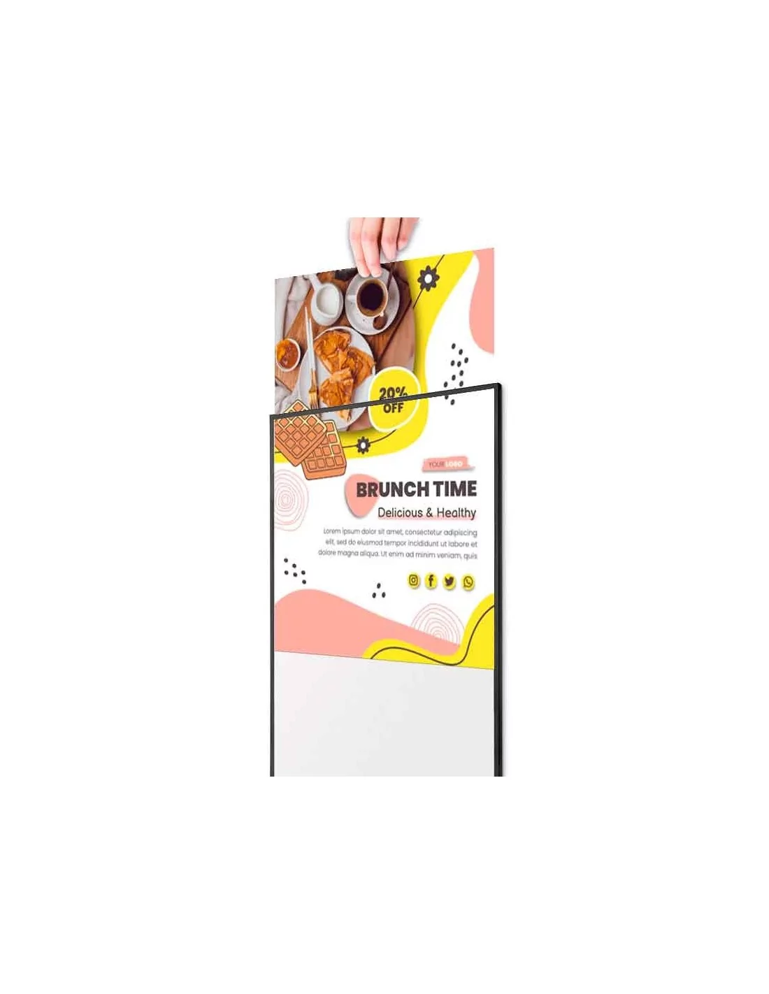 Este diseño de color negro tiene un marco fino con el perfil de tan sólo 10 mm (A3, A2) o 12 mm (A1). Depende del tamaño de marco escogido. Cuelgue fácilmte el marco en la pared y deslice el poster hacia dentro o hacia fuera siempre y cuando lo necesite. Gracias al panel LED su promoción siempre captará la atención, ¡Incluso de noche!.