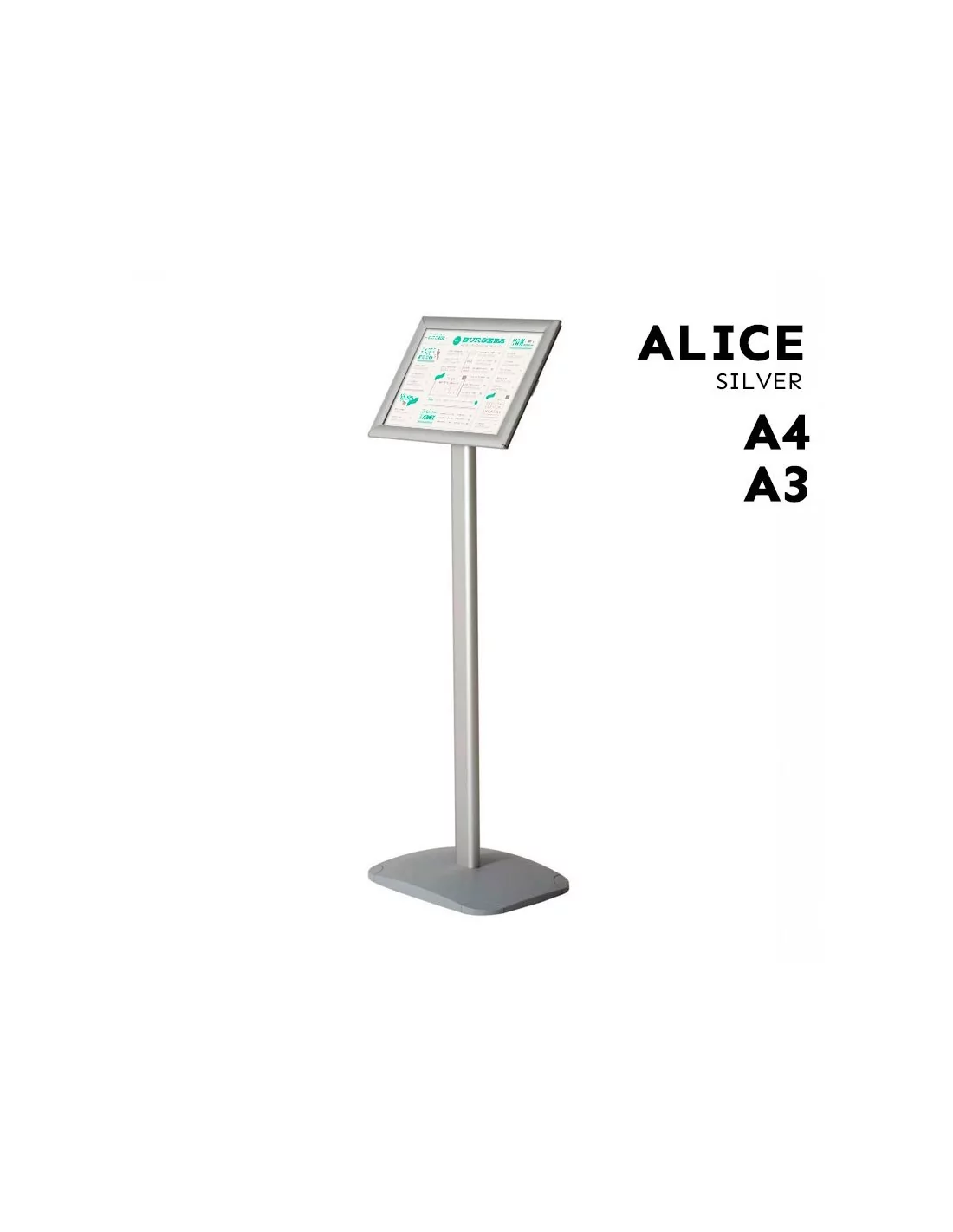 EXPOSITOR INCLINADO PORTA MENU - COLOR PLATA - A4 Y A3 - MODELO ALICE - MARCO 25 mm