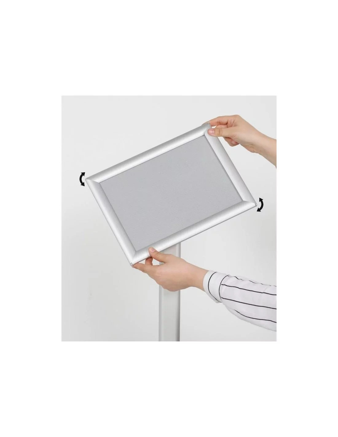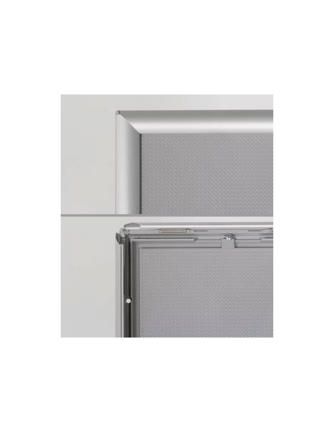 Con un sistema de fijación trasero, el expositor puede colocarse en orientación vertical u horizontal, adaptándose a diferentes tipos de contenido. Fabricado en aluminio y acero, destaca por su durabilidad, su marco de 25 mm con sistema click para un cambio rápido de gráficas, y su protección antirreflejos, que mejora la visibilidad en áreas iluminadas.