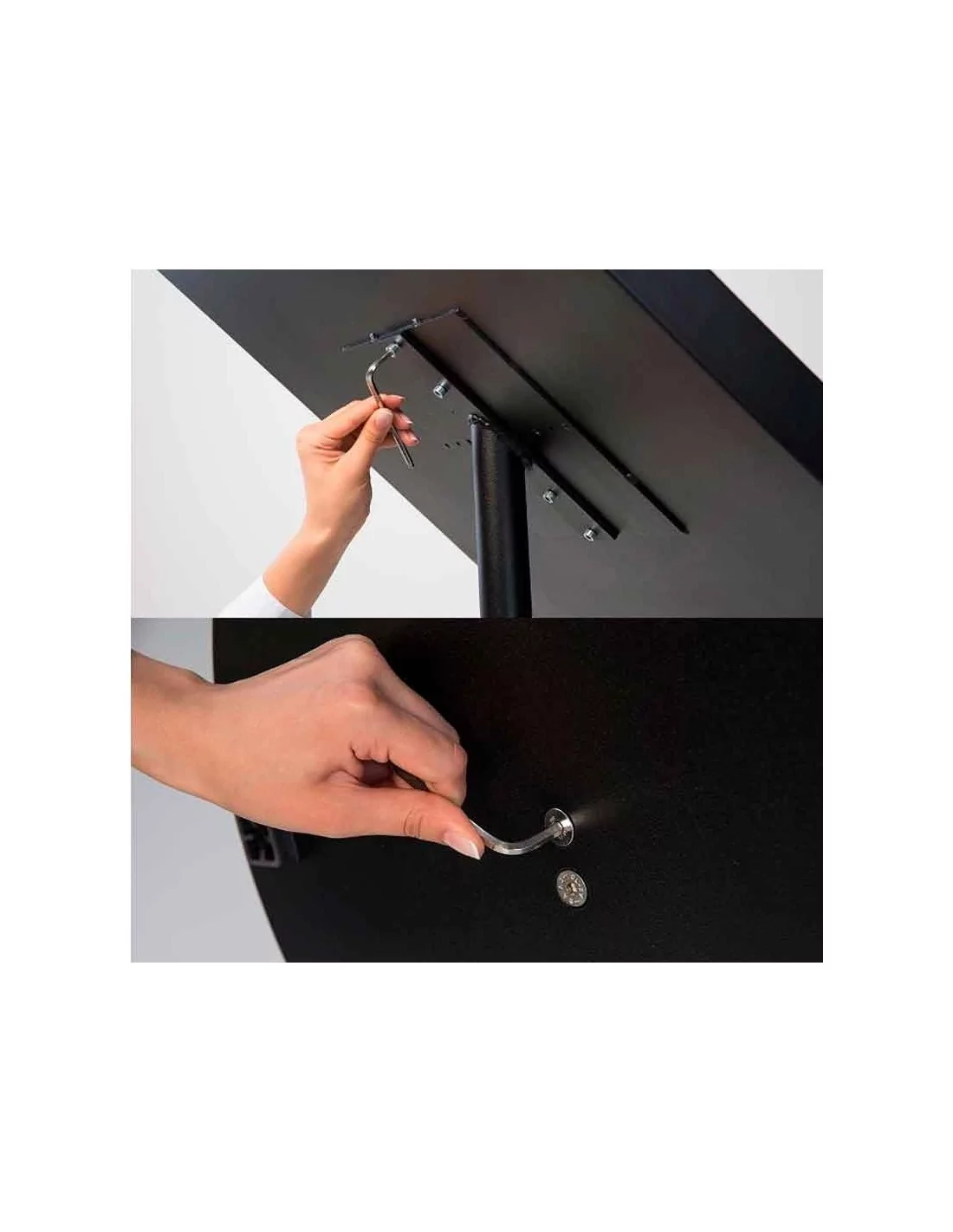 Con un sistema de fijación trasero, el expositor puede colocarse en orientación horizontal, adaptándose a diferentes tipos de contenido. Fabricado en aluminio y acero, destaca por su durabilidad, panel posterior magnético para un cambio rápido de gráficas, y su protección antirreflejos, que mejora la visibilidad en áreas iluminadas.
