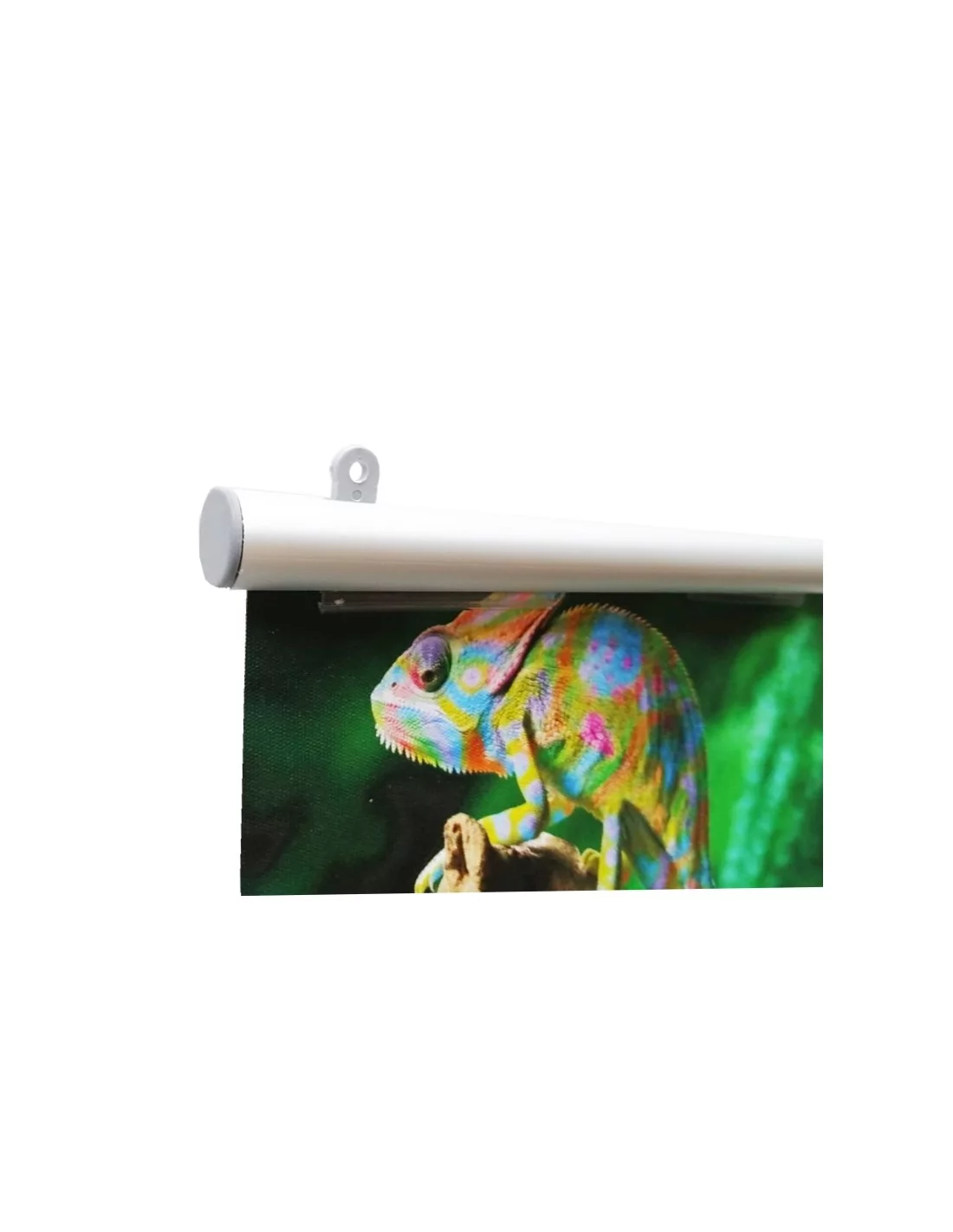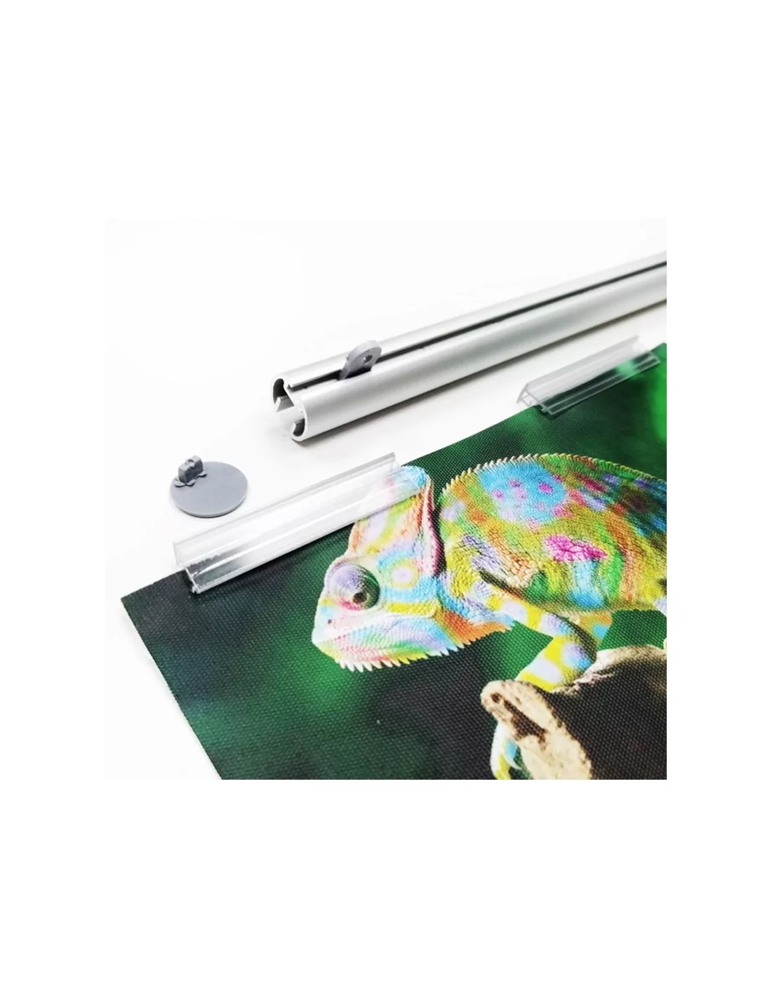 - Le système de crochet de votre affiche ou bâche aux barres en aluminium de cet écran suspendu est un peu plus lent que les systèmes pliants. Le système comprend des pièces en plastique rigide que vous devrez placer en haut de votre graphique. Ensuite, insérez ces pièces dans la barre d'aluminium, et prêt à pendre.