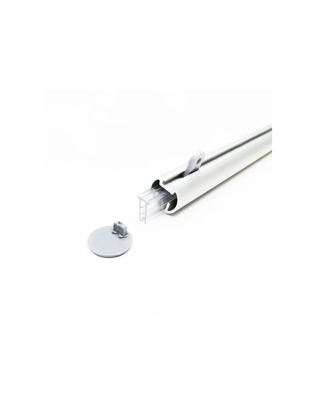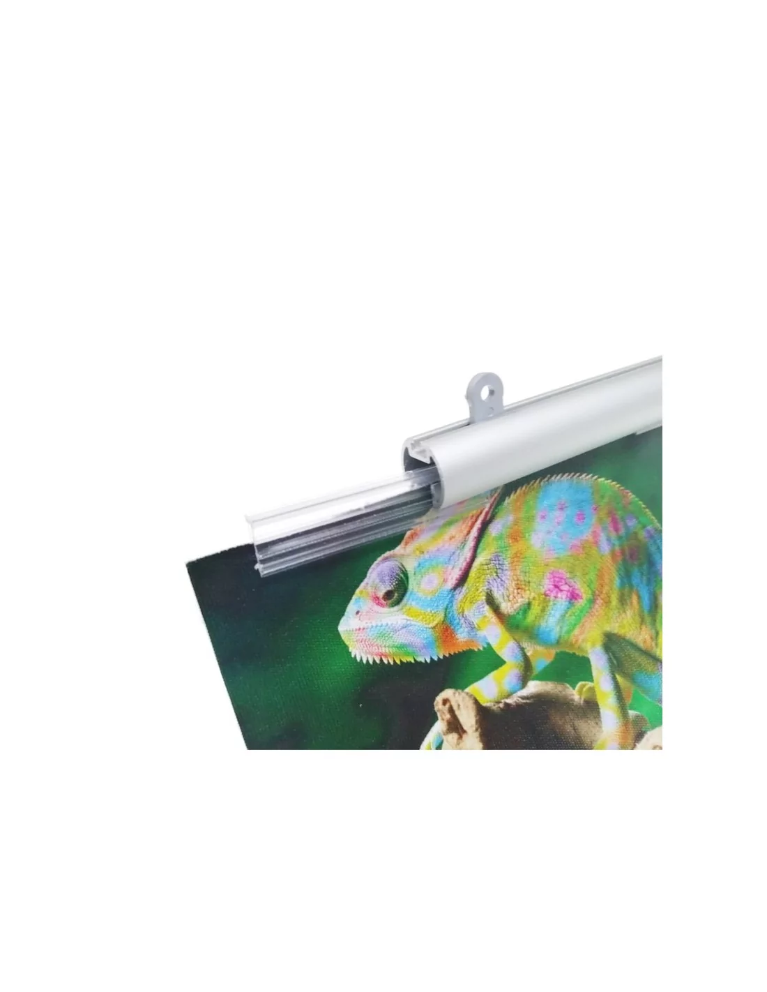 E Economic and Social système aLURONDO pour accrocher vos reins, affiches ou écrans de protection dans des animaux en plastique de faible épaisseur. Profil de BANNER composé de UNA BARRA en métal rond qui aura le graphique en haut.