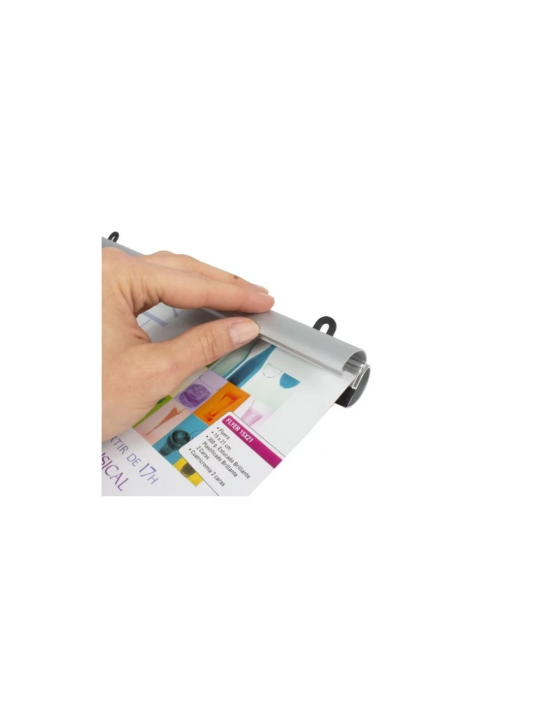 E Economic and Social système aLUTAPE pour accrocher vos reins, affiches ou écrans de protection dans des animaux en plastique de faible épaisseur. Profil de BANNER composé de UNA BARRA en métal rond qui aura le graphique en haut. Avec des housses latérales noires élégantes