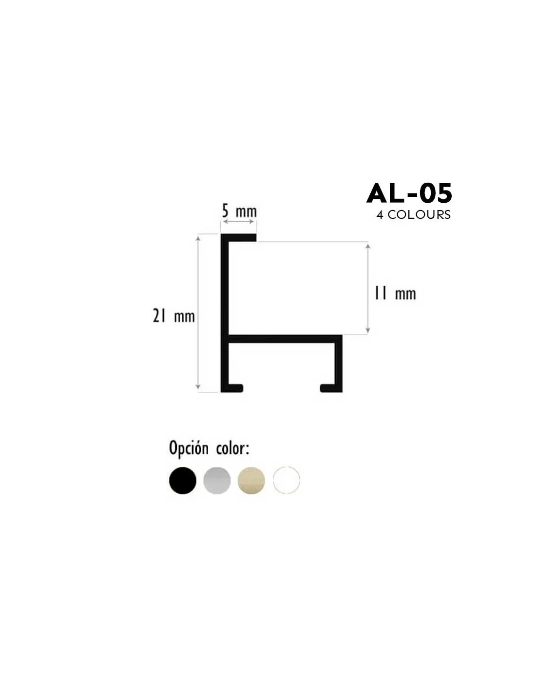 https://moldiber.com/fr/moulages-en-aluminium/moulage-en-aluminium-perfil-05-1024.html-35209#/50-couleur-negro_mate_ref020 AL-05 Profilé d'aluminium minimaliste face 5mm. AL-05 <ul> <li><strong>Face du profil :</strong> 5 mm (plat)</li> <li><strong>Hauteur extérieure du profil :</strong> 21 mm</li> <li><strong>Feuillure intérieure :</strong> 11mm (Espace pour le travail)</li> <li><strong>Couleurs disponibles :</strong> 4 (Voir détail information ci-dessous)</li> <li><strong>Longueur des barres :</strong> 300 cm (3 mètres)</li> <li><strong>Unité de vente :</strong> Paquets de 4 barres de 3 mètres (12 mètres) par couleur</li> </ul> <p style="text-align:center;"><span style="background-color:#000000;color:#ffffff;">AVIS: Le prix de ce profil se réfère à 1 mètre linéaire</span></p> https://moldiber.com/16587-connectif_default/moulage-en-aluminium-perfil-05.jpg 5.5003 instock 5.5003 5.5003 0 01468309746000/Accueil/Profilés en aluminium/Moulages en aluminium /Accueil/Profilés en aluminium/Moulages en aluminium/Moulages en aluminium pour la photographie /Accueil/Profilés en aluminiumMOLDURA ALUMINIO FOR PHOTOGRAPHY MOLDURA DE ALUMINIO FINA MOLDURA ALUMINIO ESTRECHA MOLDURA ALUMINIO MINIMALISTA