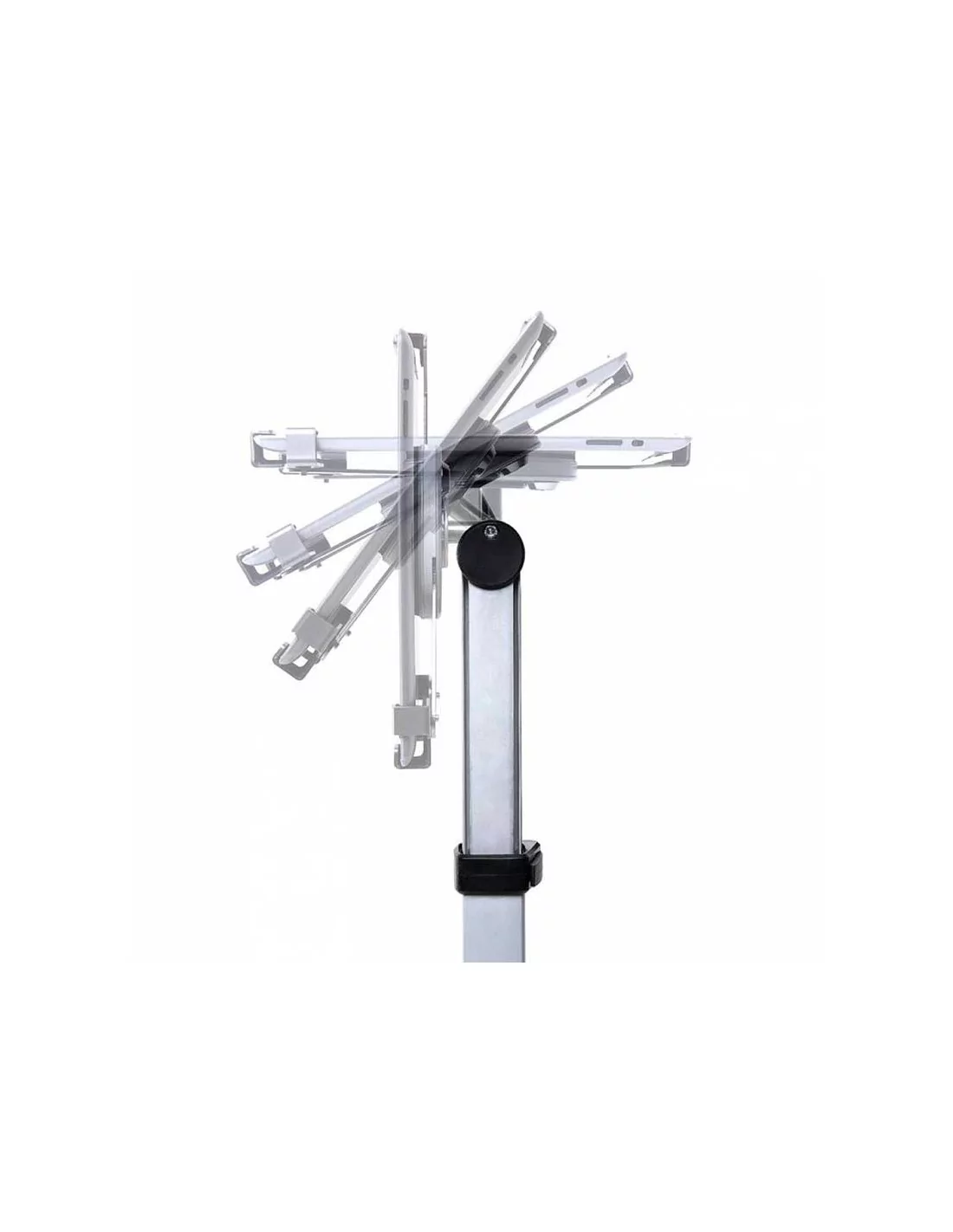Le mât télescopique en aluminium anodisé permet une hauteur variable de 740 mm à 1300 mm idéale pour salons, centres d'accueil ou borne libre-service.