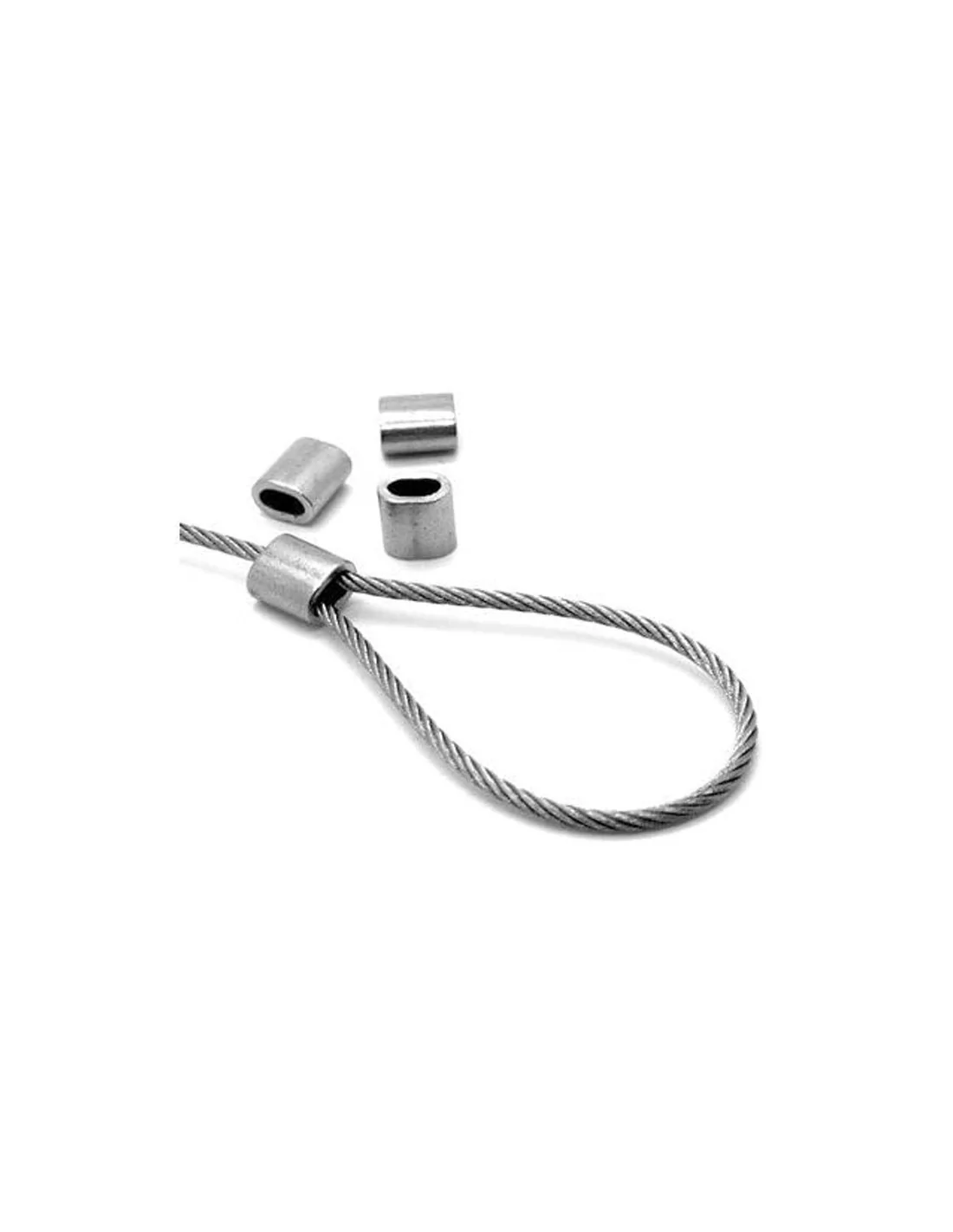 Pequenas peças semicilíndricas para fazer laços nas extremidades dos teus cabos de aço trançado tipo serga. Para fixar o casco sobre os dois cabos, vai precisar de uma pinça especial que gere pressão suficiente. Este produto é também chamado de ferros de alumínio ou ferros ovalizados.