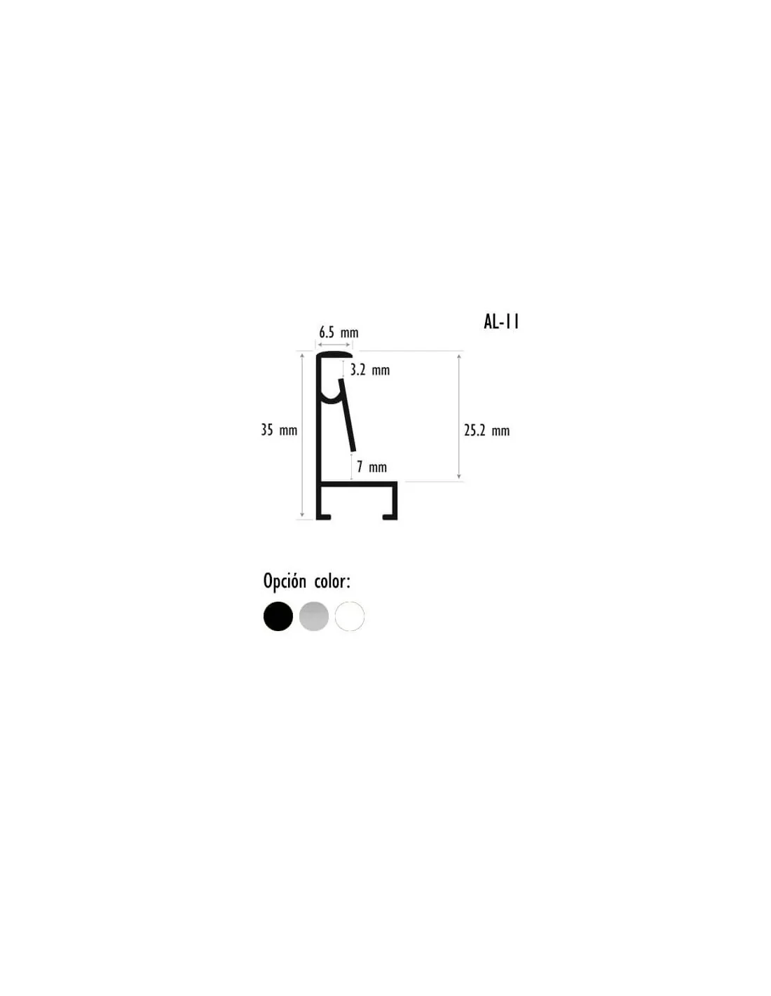 O perfil AL-11 é a nossa outra alternativa (junto com o perfil AL-08) para fabricar quadros de alumínio montados como vitrines, podendo colocar o vidro na parte superior do quadro. A diferença neste modelo é que os espaços nas pálpebras superior e inferior são maiores.